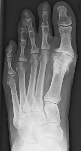 Vollständiger Aufbrauch des Gelenkspaltes des Großzehengrundgelenkes mit durch die Abnutzung bedingen knöchernen Randanbauten und wulstartigen Verdickungen im Grundgelenk