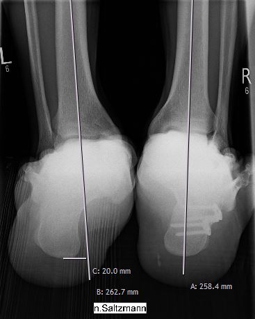 X-Förmige Abweisung der linken Ferse nach außen mit knicken des Sprunggelenkes nach innen (Gegenseite bereits korrigiert)